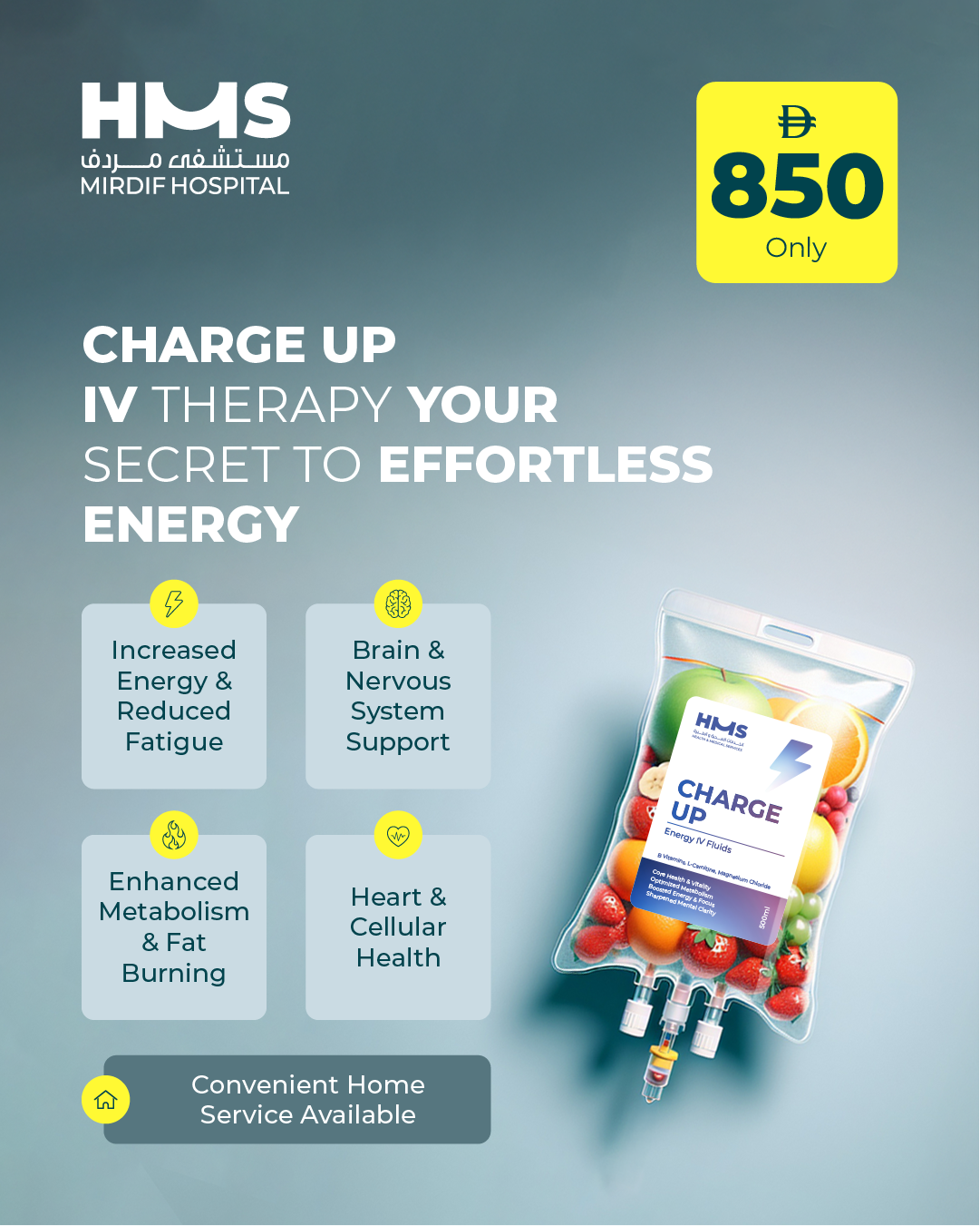 At HMS Mirdif Hospital, our Charge Up IV Therapy is expertly formulated to boost cellular energy production, support heart and brain health, and enhance overall vitality. Whether you're battling fatigue, recovering from workouts, or simply need a performance edge, this infusion is for you.